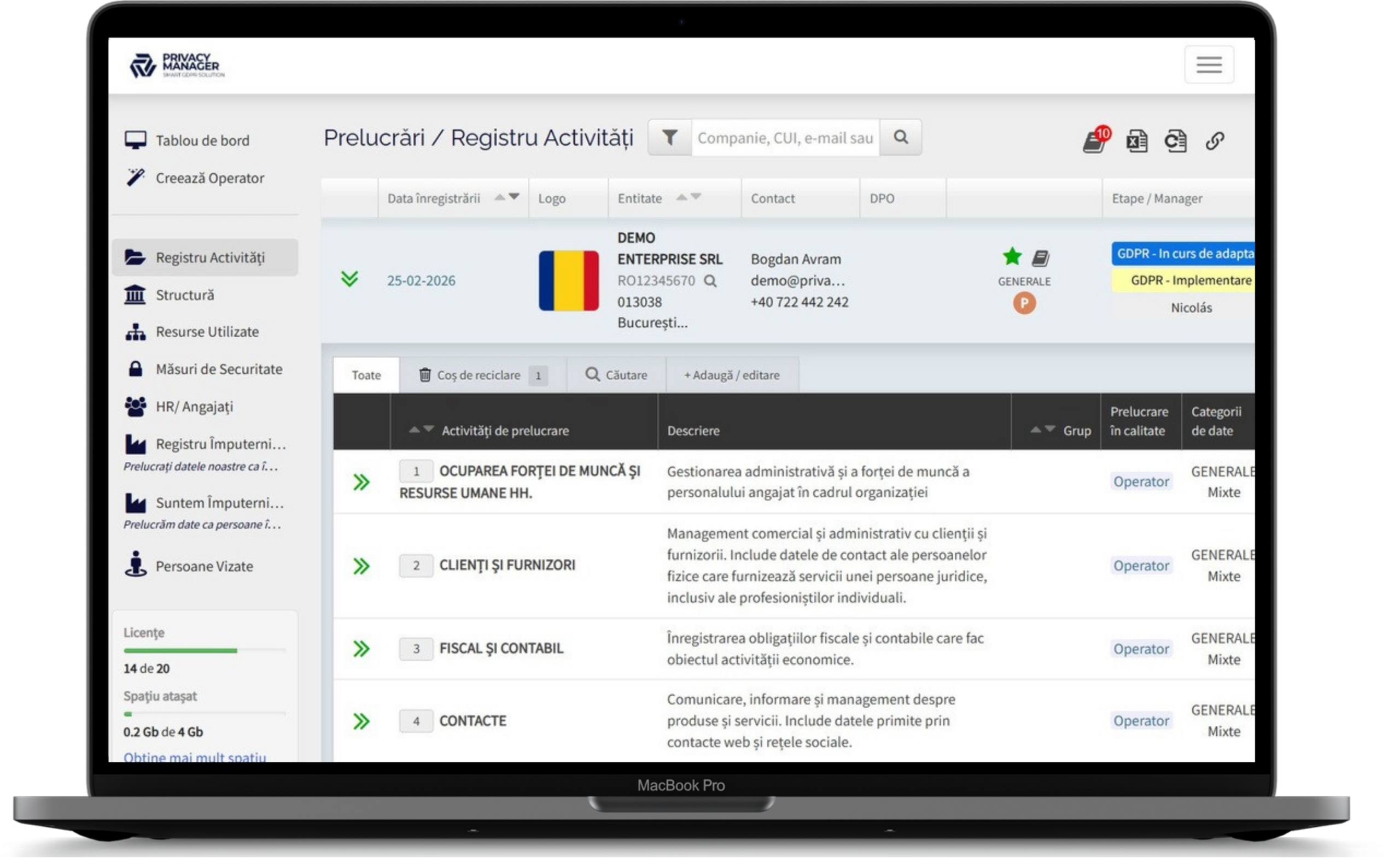 Date angajați, documente, traininguri GDPR, acorduri de confidențialitate și evidența instruirilor obligatorii.