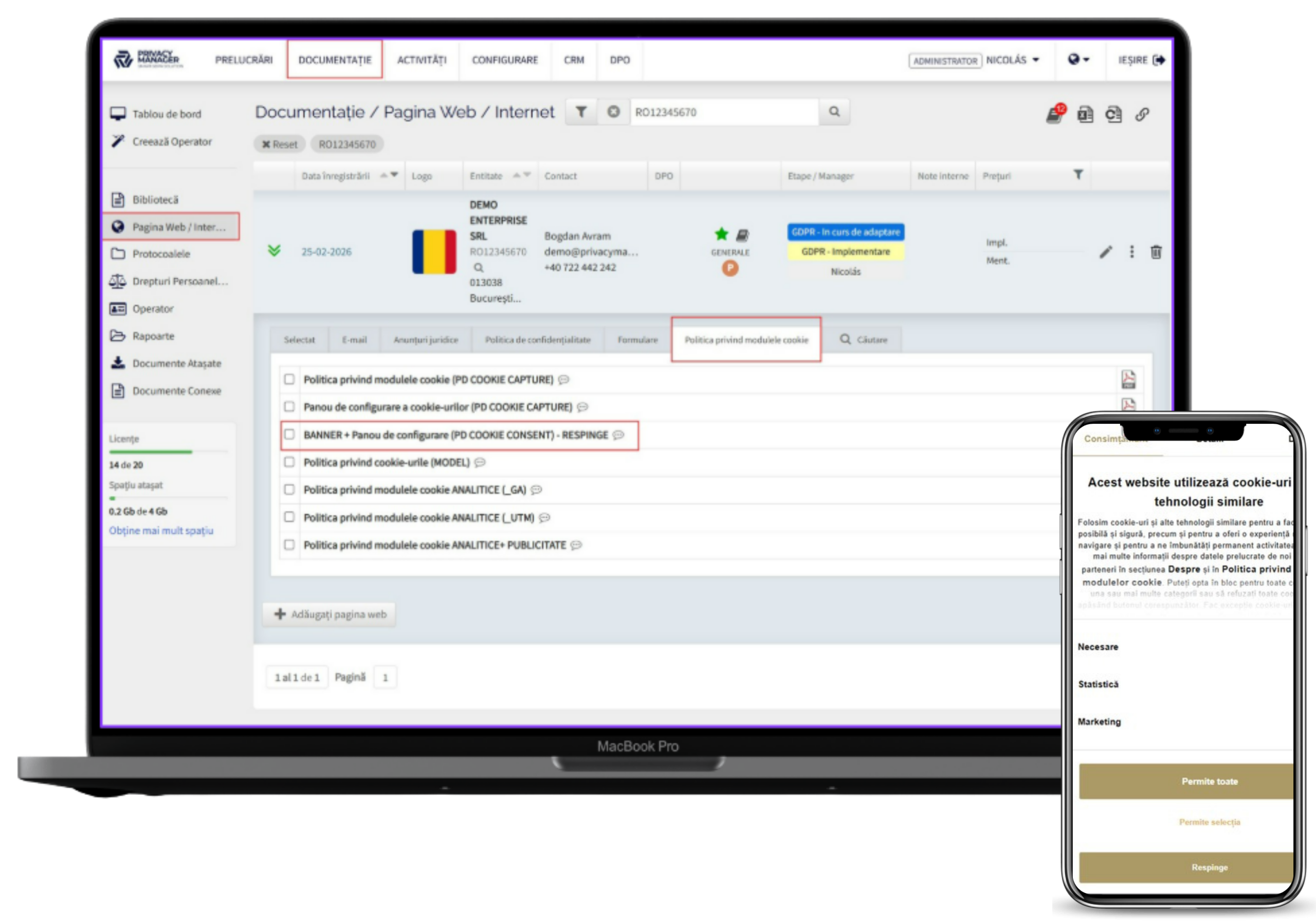 Platforma include un modul complet de gestionare a cookieurilor, aliniat cu GDPR și ePrivacy: scanare automată a siteului, identificarea și clasificarea cookieurilor (necesare, funcționale, marketing, analytics), generare de bannere conforme și blocarea scripturilor până la consimțământ.